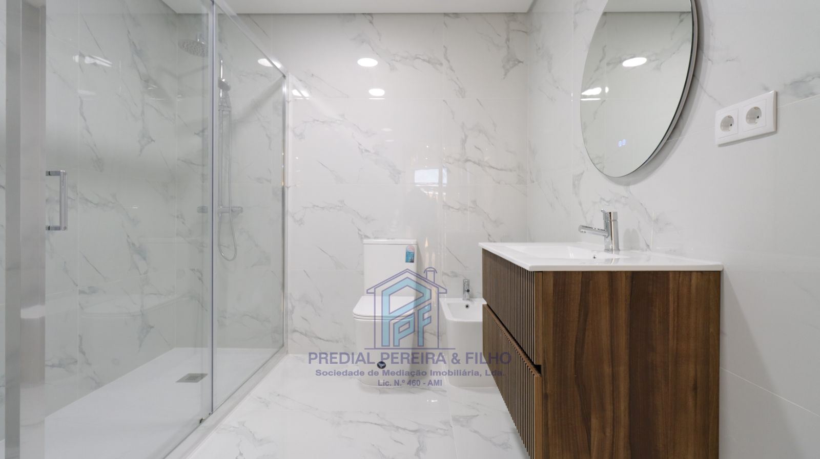 • Banho completo enorme com móvel e espelho com led, com base de chuveiro com resguardo;