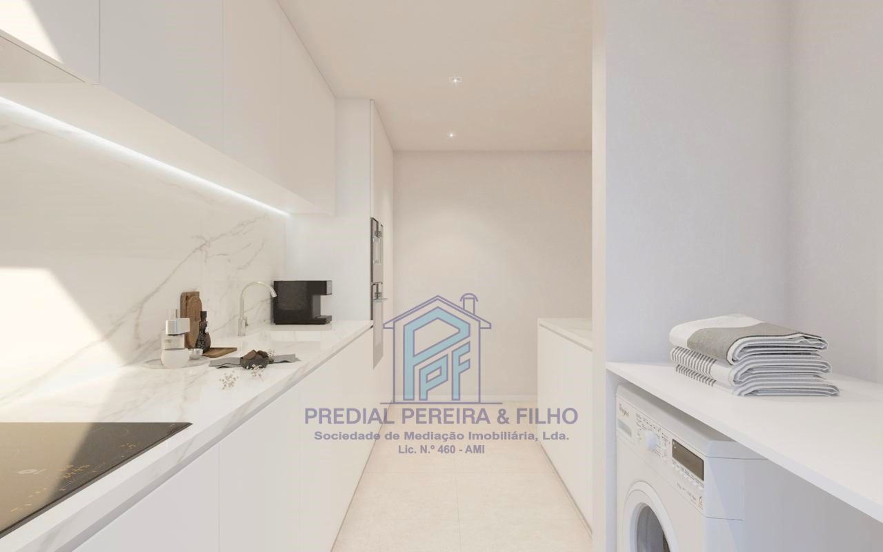 • Sala Comum e cozinha em open space com 25m2, com móveis lacados a branco, com placa vitrocerâmica, forno, micro-ondas, máquina lavar louça e combinado